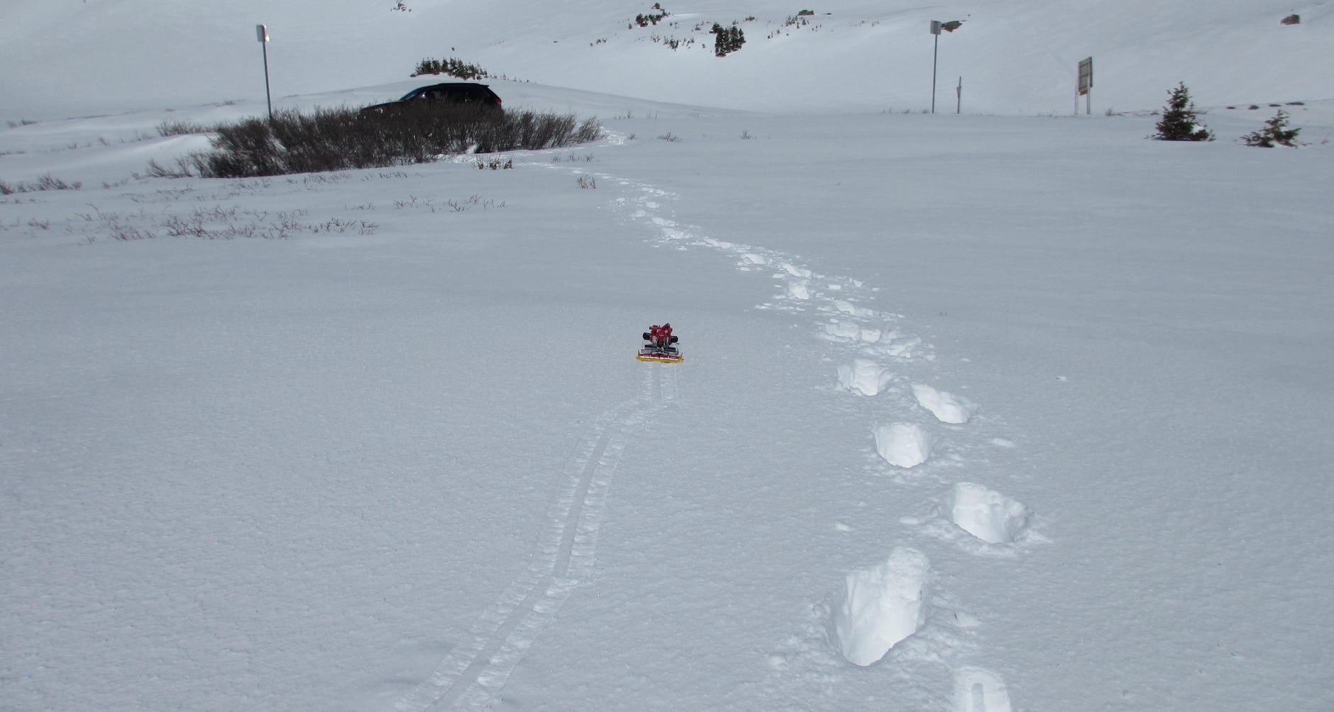 The first mission in snow was on May 20th, 2015 at Loveland Pass, Colorado at 3600m (11,800 ft) above sea level. The fresh snow provided nearly ideal conditions, although the snow quickly turned sticky in the morning sun and subsequently got stuck on the track claws.