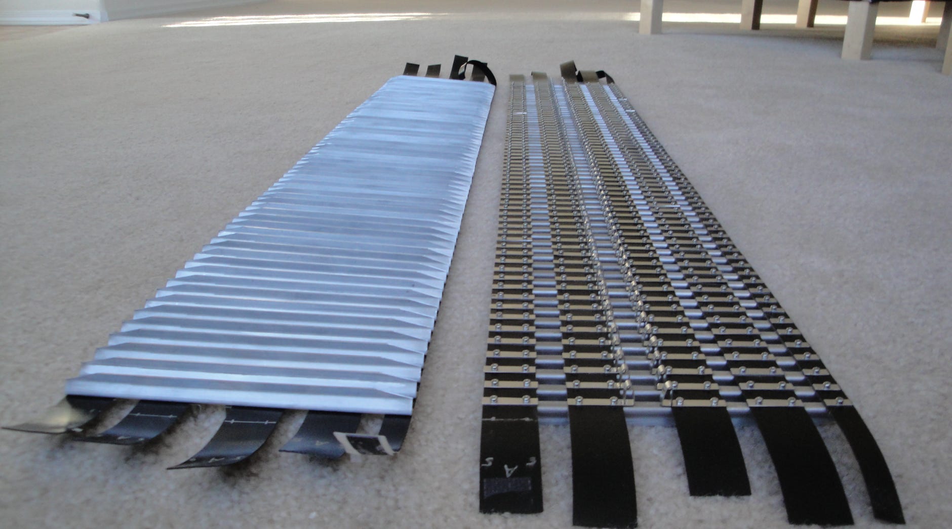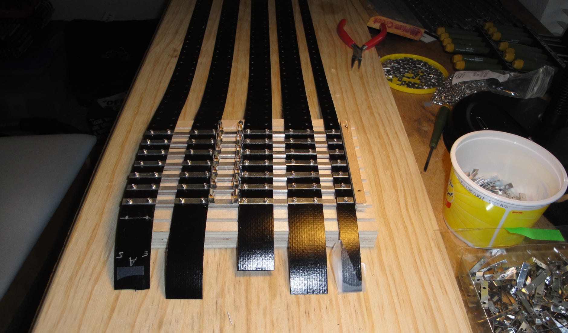Für die jeweils 70 Stege (berechnet wurden 64, aber sicherheitshalber macht man mehr) waren insgesamt 1260 Schrauben notwendig, also 2520 Löcher gebohrt, 1278 Löcher in die Bänder gestanzt und 1260 M2 Gewinde geschnitten.