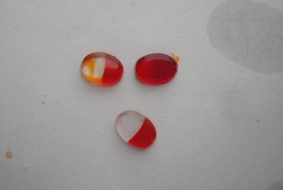 Zuerst wurde der rote bzw. klare Teil in der halbierten Form hergestellt. Die ausgehärteten Teile wurden dann in die Komplettform gelegt und der orange Teil gefertigt. Deshalb ist bei praktisch allen Gläsern etwas oranges Harz auf der anderen Farbe, welches durch Schleifen und Polieren entfernt werden muss. Im Bild oben rechts sieht man links oben ein Glas, wie es aus der Form kommt, und unten das fertig polierte Glas.
