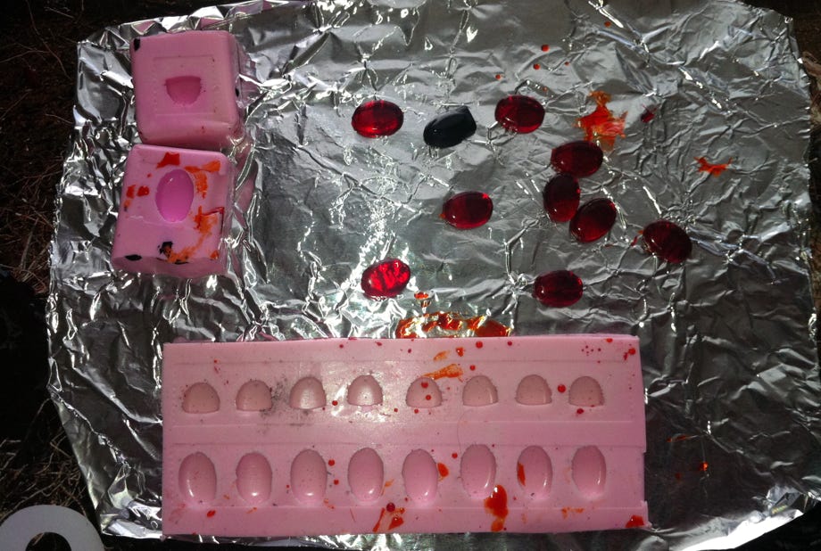 Das transparent aushärtende Harz wurde mit rot bzw. orangem Pigment angerührt und in der Vakuumkammer entgast. Trotzdem konnte eine Bläschenbildung bei den Gläsern nicht gänzlich vermieden werden. Dieses spezielle Harz musste anschließend im Backofen 1 Stunde ausgehärtet werden. Wenn das Mischungsverhältnis nicht perfekt stimmte, wurden die Gläser milchig und wir mussten wieder von vorne anfangen. Hier hat es sich bewährt, deutlich mehr Harz anzurühren als benötigt wird, weil man bei größeren Mengen das Mischungsverhältnis exakter einhalten kann.
