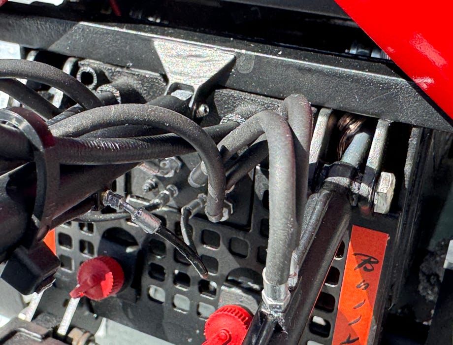 Bei den neueren Versionen des Geräteträgers gehen nurmehr 3 dicke Schläuche von der Wanne zum Hydraulikverteiler. Wenn man den 8-Wege Geräteträger von Pistenking hat, dann sind zwei davon bereits die Seilzüge zu den Tiltzylindern. Im Original sind die 3 Schläuche links am Hydraulikverteiler montiert. Nachdem der Pistenking-Geräteträger mit der Tiltfunktion in diesem Bereich nicht originalgetreu sein kann, und auch nicht die neuere, quaderförmige Abdeckung hat, habe ich den 3. Schlauch einfach mittig in den Hydraulikverteiler geführt (siehe großes Titelbild oben).