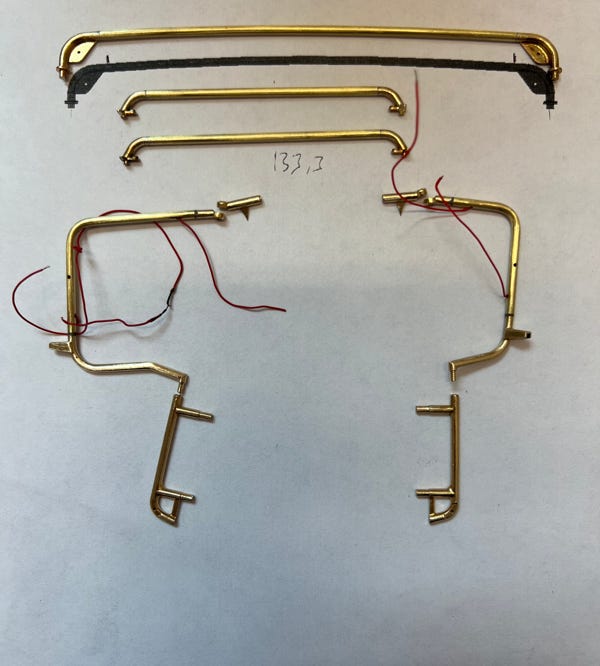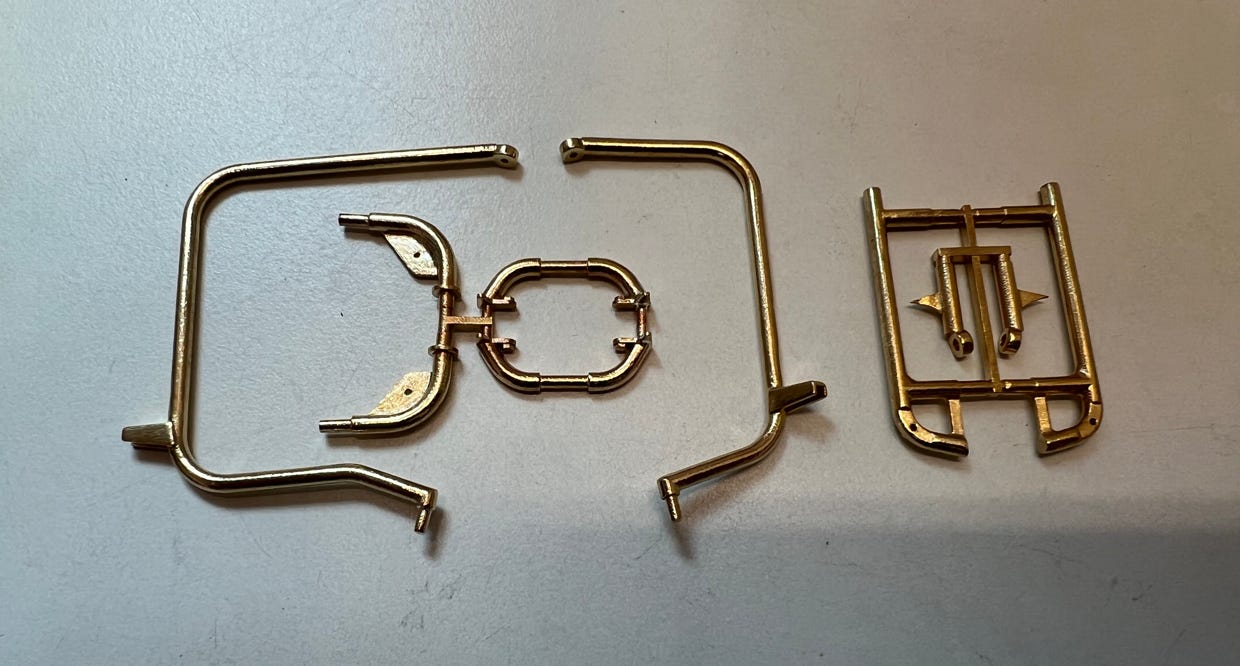 Die Haltestangen und Befestigungen für die Spiegel und Zusatzscheinwerfer sind aus Messingdruck, wobei ich in bewährter Weise Messingrohre eingelötet habe. Damit können bei den Spiegelhalterungen auch die Litzen für die Scheinwerfer originalgetreu innen geführt werden.