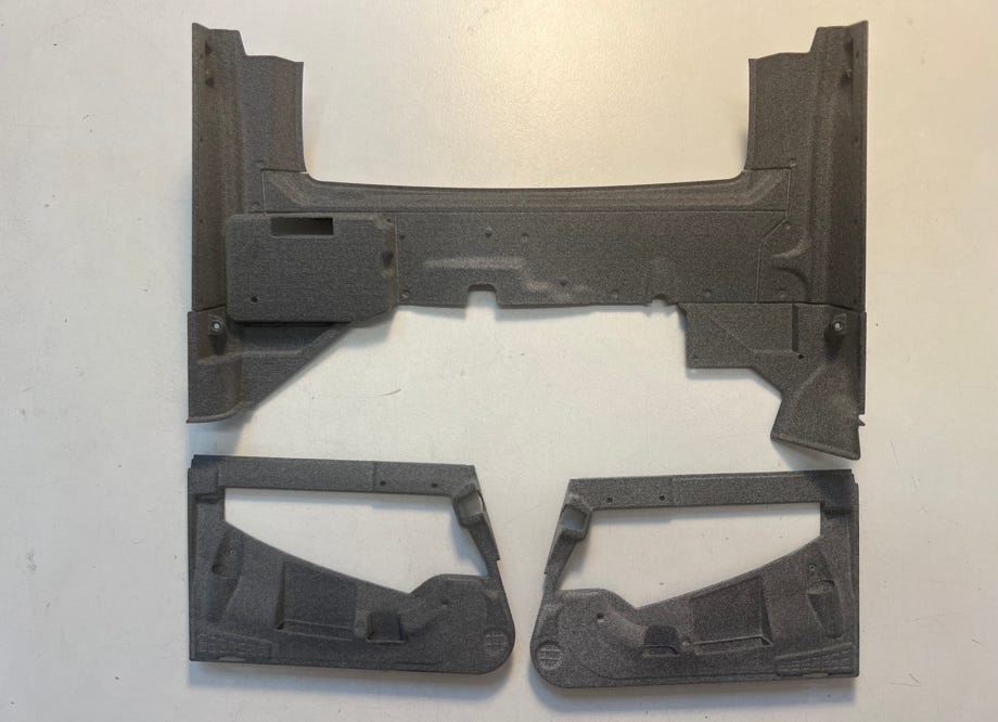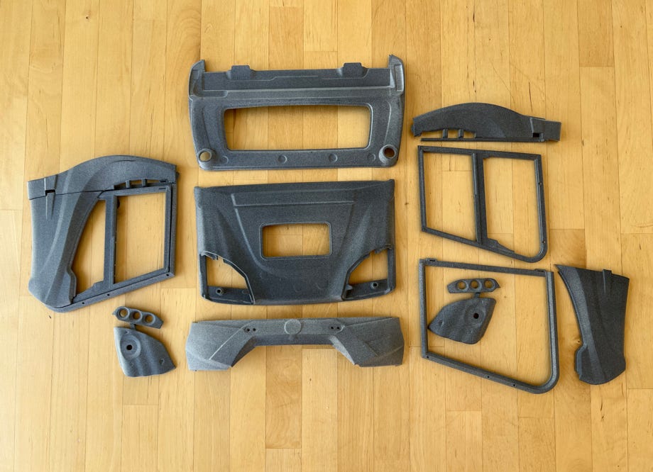 Danach kam die Innenausstattung dran, auch dafür hatten wir die CAD-Daten erhalten. Die Bodengruppe und Mitteltunnel sind exakt dieselben wie beim aktuellen PB600 und konnten damit direkt vom vorhanden Bausatz von Pistenking übernommen werden, ebenso die Sitze. Auch die Bedienkonsole + Joystick ist gemäß dem identischen Bedienkonzept aller PistenBully gleich und war vorhanden. So reduzierte sich die Arbeit auf Rückwand, Dach und Türverkleidungen.