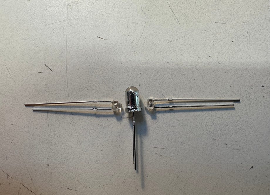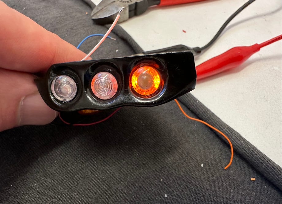 Die Scheinwerfer im Dach wären einfach gewesen, wenn PistenBully nicht einen ringförmigen Blinker verwendet hätte. Nach einigem Überlegen und Versuchen entschied ich mich, für diesen Effekt zwei kleine orange LEDs seitlich einzukleben, und die 5 mm LED vom Scheinwerfer mit Alufolie zu umwickeln. Damit kommt der Effekt recht gut heraus. Für den Bausatz wird Pistenking allerdings eine Platine mit ringförmig angeordneten Micro-LEDs anbieten, damit erspart man sich diesen fummeligen Einbau.