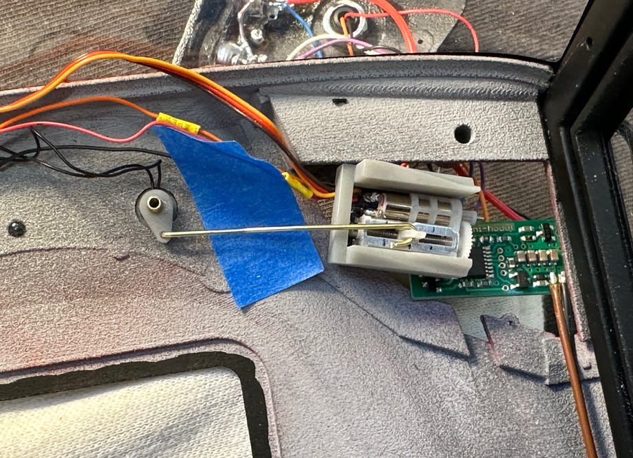 Ich hatte noch winzige Linearservos übrig, und kam auf die Idee, damit den Suchscheinwerfer am Dach drehbar zu machen. Tatsächlich war dafür genügend Platz zwischen Dach und Dachhimmel vorhanden. Winzige Kugellager dienen zur Lagerung, und die dünnen Litzen werden durch ein Röhrchen mit nur 1 mm Innendurchmesser geführt. Der Einbau erwies sich ebenfalls als eine fummelige Geduldsprobe.