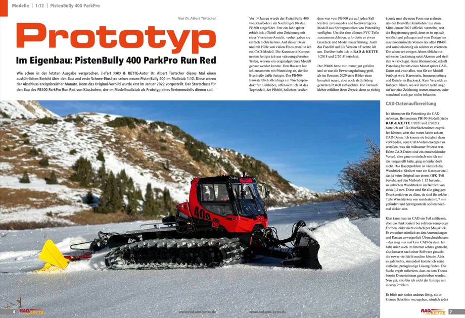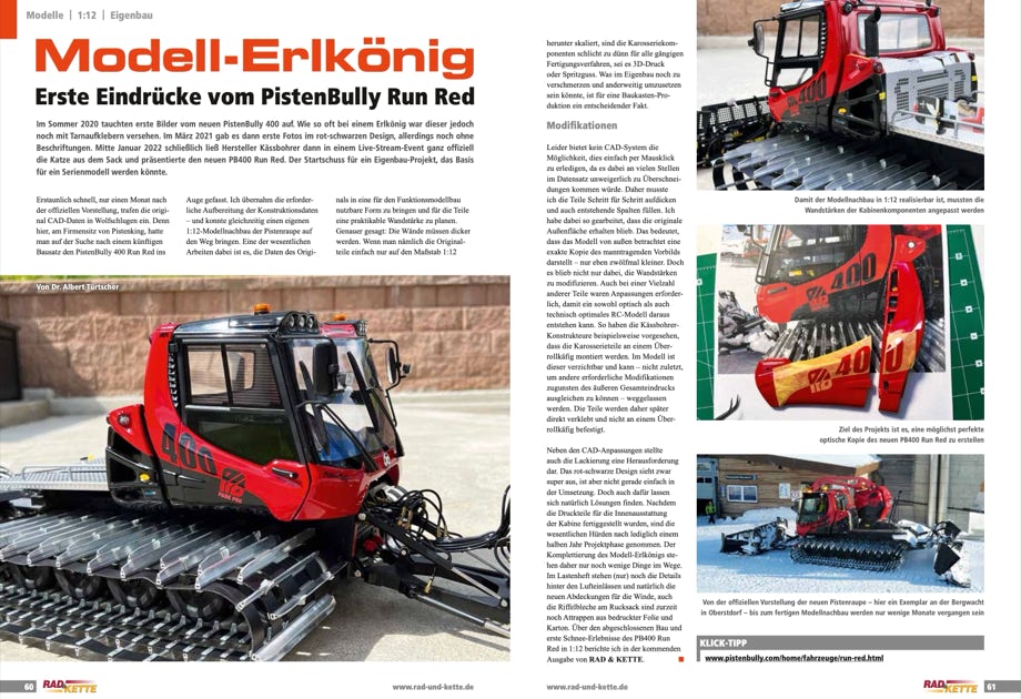 Im Fachmagazin Rad & Kette 4/2022 ist eine Vorschau, und in 1/2023 ein ausführlicher Artikel von mir über den Bau der Fahrerkabine des neuen PB400 Run Red veröffentlicht worden.