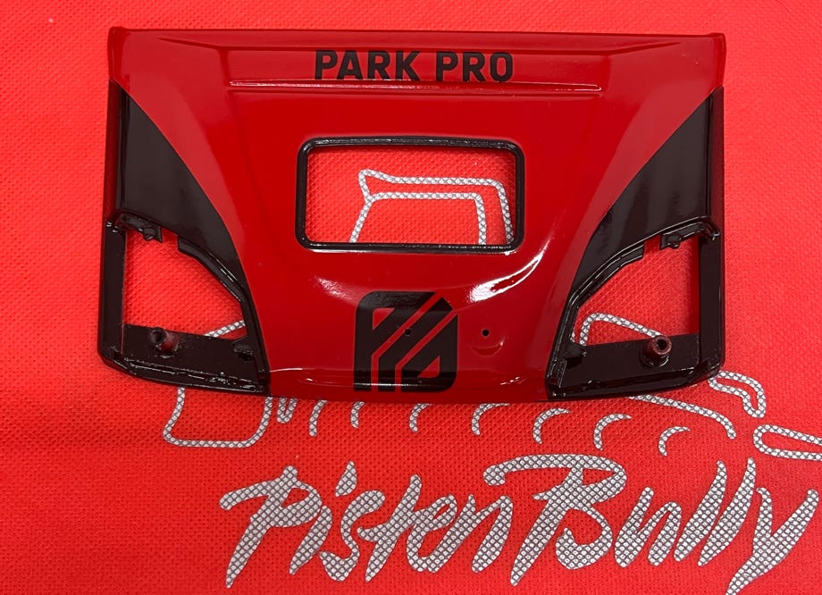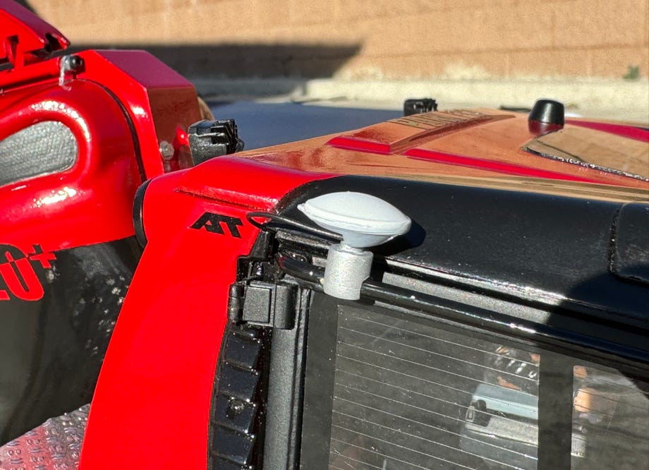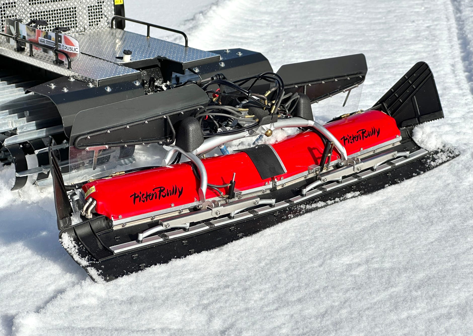 Die Fräse hat beim Original schwarze Finisher, also wurden diese ebenfalls ausgetauscht. Bei der ParkPro Version sind die oberen Teile des Überwurfschutzes schwarz statt transparent, diese waren aus schwarzen Kunststoffplatten auf meiner Stepcraft in CNC schnell hergestellt. Und der Schneideplotter erzeugte die schwarzen PistenBully Logos.