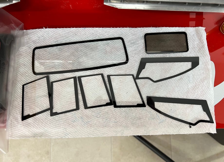 Für die Innenausstattung waren dann noch jede Menge Details zu machen, die ich im Feindruckverfahren herstellen ließ. Diese müssen unbedingt mit Silberfarbe grundiert werden, da sie nicht UV-stabil sind. Bei der Fußmatte sieht man auch, wie man nach einer Grundierung die Drucklinien erkennen und wegschleifen kann.