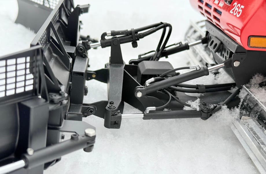 Der Geräteträger ist auch deutlich länger, damit befindet sich die Fräse auch weiter vom Fahrzeug entfernt. Der Hubzylinder arbeitet hier auf Zug und ist deshalb massiv ausgeführt. Das macht es für den Modellbauer einfacher: das Seil zum heben bleibt in der Wanne und damit unsichtbar.