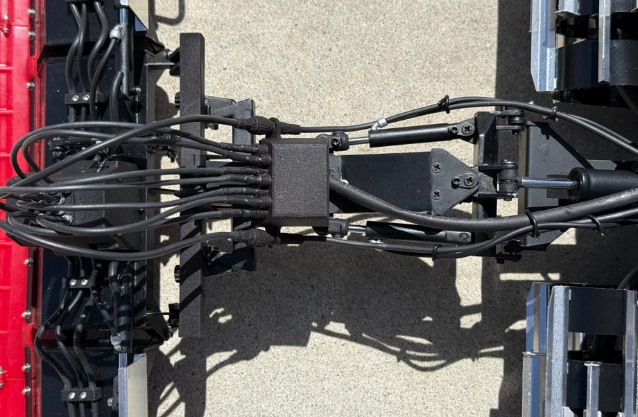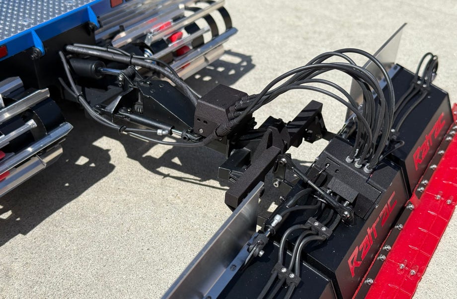 Der vordere Geräteträger ist eine sehr interessante Konstruktion. Aus welchen Gründen auch immer hat Ratrac damals das inzwischen überall gebräuchliche Kugelgelenk nicht verwendet, sondern jedes Gelenk für die 4 Funktionen separat ausgeführt: