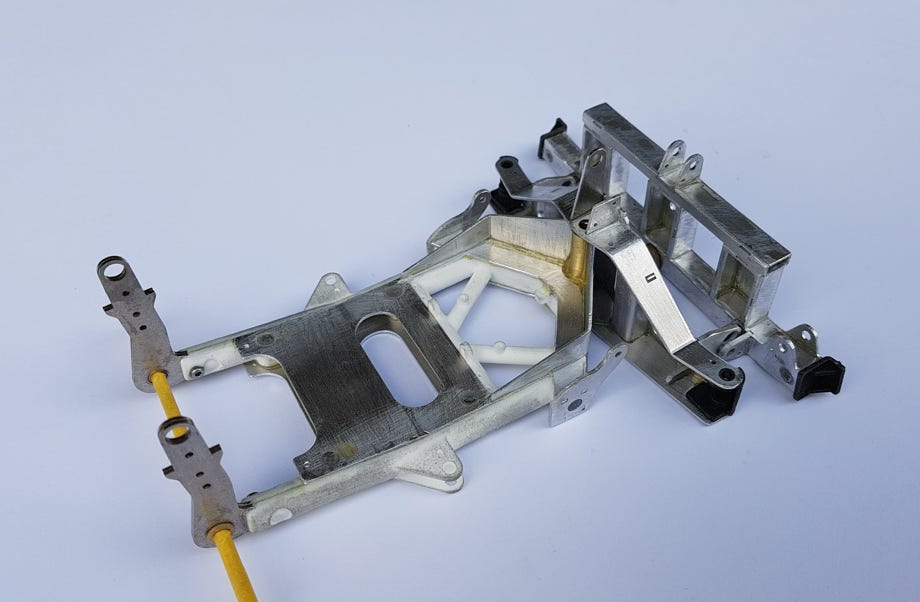 Das Fahrgestell ist eine solide Konstruktion aus Blechteilen, die ich mit UHU plus endfest 300 im Backofen verklebt habe. Interessant ist der fixe Ausleger hinten für den Heckgeräteträger.