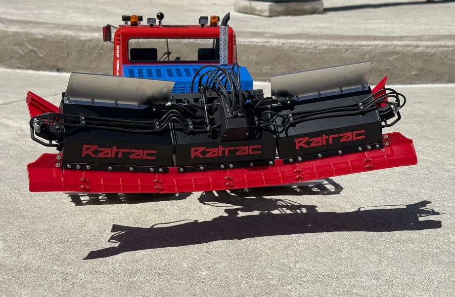Die Ratrac 265 wurde 1992 erstmals in USA vorgestellt, und zwar als LMC 3700 CF, in Europa wurde sie als Ratrac 265 verkauft. Diese Raupe war ihrer Zeit technisch voraus, allerdings wurde sie auch von einigen Problemen geplagt. Sie war eine der letzten Ratrac Pistenraupen, es folgte nur noch die 400 mit zwar gleicher Kabine, aber anderer Technik. Das Vorbild für unser Modell ist Baujahr 1996 und war noch 2018 an der Ganzsteinschanze in Mürzzuschlag in Österreich im Einsatz, wo es von den Schweizer Modellbauern fotografiert und abgemessen wurde.